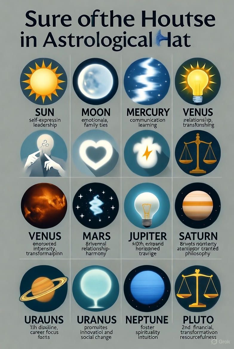 تأثير الكواكب في البيوت الفلكية هو موضوع واسع في علم التنجيم، حيث يحدد موقع كل كوكب في بيت معين (سواء في الخريطة الناتالية أو خلال عبوره) الطاقات والتأثيرات على جوانب الحياة المختلفة. الكواكب تمثل قوى ديناميكية (مثل الشمس للذات، القمر للعواطف، إلخ)، بينما البيوت تمثل مجالات الحياة (كما شرحت سابقاً). التأثير يعتمد أيضاً على البرج الذي يقع فيه الكوكب، جوانبه مع كواكب أخرى، وقوته (مثل ما إذا كان في برج حاكمه أو ضعيف). سأقدم هنا تلخيصاً أكثر تفصيلاً مقارنة بالسابق، مع توسيع الشرح لكل كوكب في كل بيت، مستنداً إلى الدلالات التقليدية والحديثة، مع أمثلة على التأثيرات الإيجابية والسلبية المحتملة، والعبورات (transits) حيث ينطبق. هذا ليس شاملاً لكل الجوانب، لكنه يغطي النقاط الرئيسية لفهم أعمق. 12